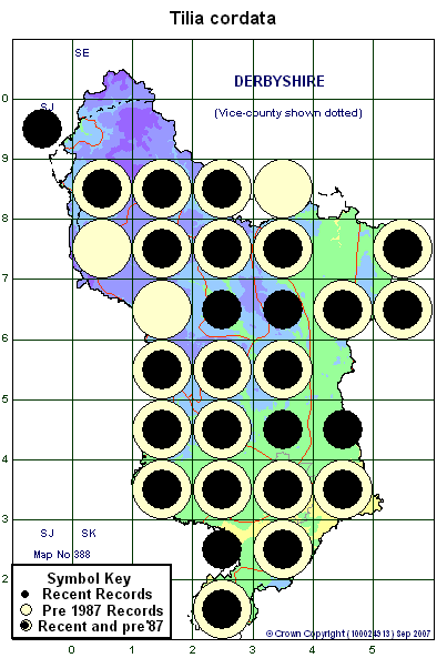 Small-leaved Lime is a very rare native tree of ancient, often rocky, woods in the White Peak (Pigott 1969) such as at Matlock Bath (SK2959). In the White Peak it often occurs with Large-leaved Lime (XXT. platyphyllos) and their hybrid. It is native but less frequent in woods on the Magnesian Limestone (Pleasley Vale SK5265), and in some of the gritstone cloughs of the Dark Peak (??Bretton or Abney Clough SK????). It is also widely but rarely planted throughout our area in parks gardens and woods. Some of these records in woods may include native trees such as at Grange Wood (SK2714), Linacre Woods (SK3272) and Hermit’s Wood (SK4438). It rarely sets seedlings in our county (Clapham 1969).