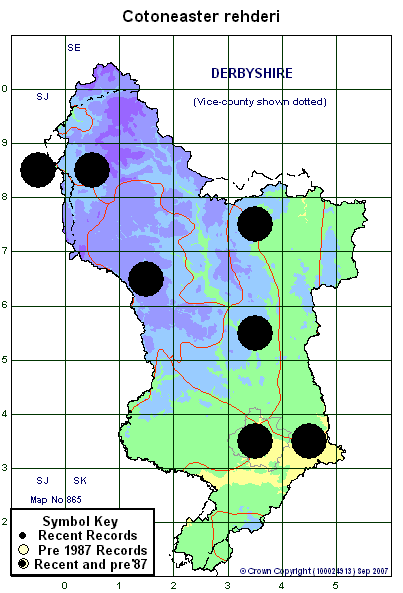 Bullate Cotoneaster is a very rare casual shrub of waste ground and woodlands. This native of Western China is much grown in gardens, from where it is spread by birds. There are three local records from Long Eaton (SK4934), Frith Wood (SK3678) and Butterley (SK3951).