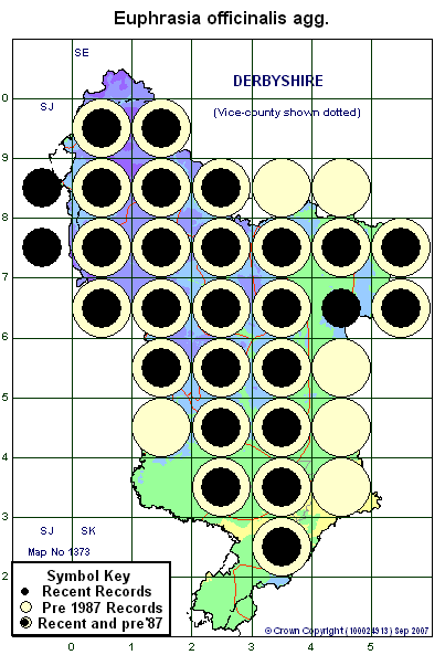 This aggregate includes all Eyebrights that occur locally, as few Derbyshire recorders have distinguished between the various species that occur. Where they have, these are noted individually below, but all are probably very under-recorded. The aggregate is a native annual semi-parasite that grows on the roots of a wide range of herbs and small shrubs, mainly in unimproved permanent grassland. It is common in the White Peak and some adjacent areas; occasional on the Magnesian Limestone as at Whitwell Wood (SK5277); and rare elsewhere as at Ticknall Quarries (SK3623) in the south of our area. It was previously more frequent outside its current core area of the White Peak.