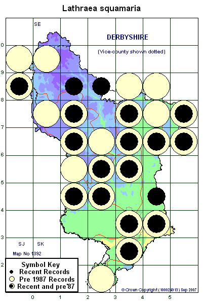 Toothwort is a rare native annual or perennial that grows as a total root parasite on woody plants in hedges, scrub and woodlands. It typically grows on Hazel (XXCorylus avellana) but has also been recorded locally on poplar (XXPopulus species) and Beech (XXFagus sylvatica). It grows occasionally throughout our area from Brook Bottom (SJ9786) and Offerton Stepping Stones (SK2181) in the north, through Shacklow Wood (SK1769) and Rose End Meadows (SK2956), to Hermit’s Wood (SK4438) and Mere Pond (SK3622) in the south.