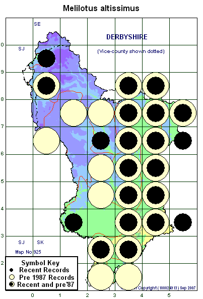 Tall Melilot is a long-established perennial of rough grassland, waysides and disturbed ground, and is native to continental Europe. It is occasional throughout the lowland north-western and eastern parts of Derbyshire. It ranges from Furness Vale (SK0183) and Newhall (SK2721), to Cambro Tip (SK4557) and Williamthorpe (SK4266).