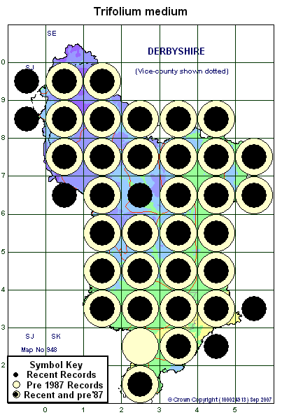 Zigzag Clover is a native perennial of grasslands, waysides, scrub and disturbed ground, generally on heavy soils. It is frequent to occasional in the Natural Areas of the White Peak, Peak Fringe, Coal Measures and Magnesian Limestone. (e.g. Dowey Lumb SK378; Westhouses SK4258, and High Peak Trail SK1958). It is rare and scattered elsewhere, with examples at Melandra Castle (SK0195), Swainspark (SK2916) and Ingleby (SK3527).